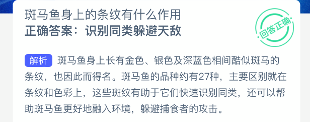 以上就是斑马鱼身上的条纹有什么作用?神奇海洋今天答案最新2025年11月8日分享,更多相关攻略内容,请点击关注更新!