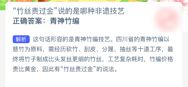 以上就是“竹丝贵过金”说的是哪种非遗技艺?支付宝蚂蚁新村最新答案2025年11月8日,更多精彩内容,请点击关注更新!