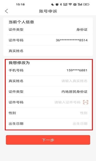 6、填写我想修改为的身份证信息,然后点击下一步根据身份认证流程,进行人脸识别即可
