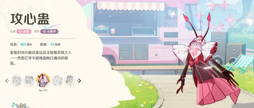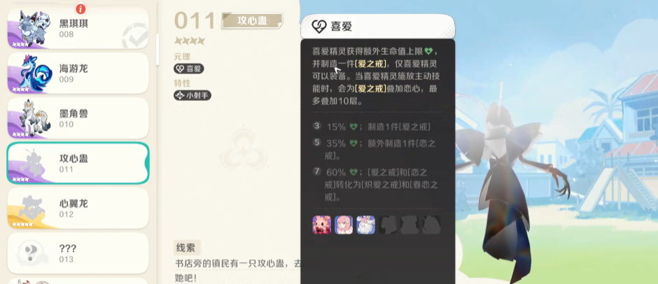 攻心蛊这个精灵目前它的元理是比较特殊的,喜爱元理的精灵目前是非常少见的,他在游戏当中身高非常高,达到了163cm,而且需要的能量也非常多,74能焦可以使用这个精灵,游戏当中他在喜爱元理上面是可以根据本身的基础数值,带来额外生命数值上限提升的,并且还可以在一开始就制造一件爱之戒,这个爱之戒是只有喜爱元理的精灵才可以进行装备的,特别是当其中喜爱类型的精灵,他们释放了自己的主动技能之后。