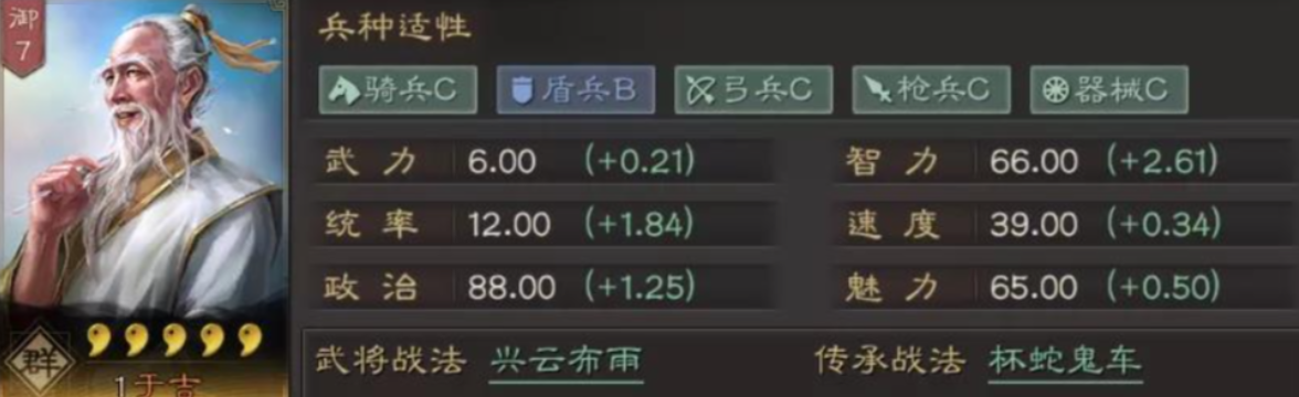 从属性上看,于吉武力值较低,无法完成高爆发输出的任务,智力尚可,但是面对顶级谋士时还是有些吃力。但是于吉的统率成长值达到1.84,这是他数据上最突出的地方,让他在生存和控制上都比较稳定。并且他还拥有30%的“仙人”属性,这个标签使得他在兵种选择上没有限制,几乎可以适应所有的兵种,从而在战场上具有很强的灵活性。
