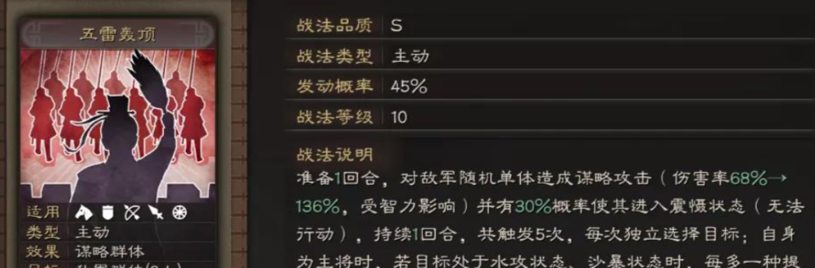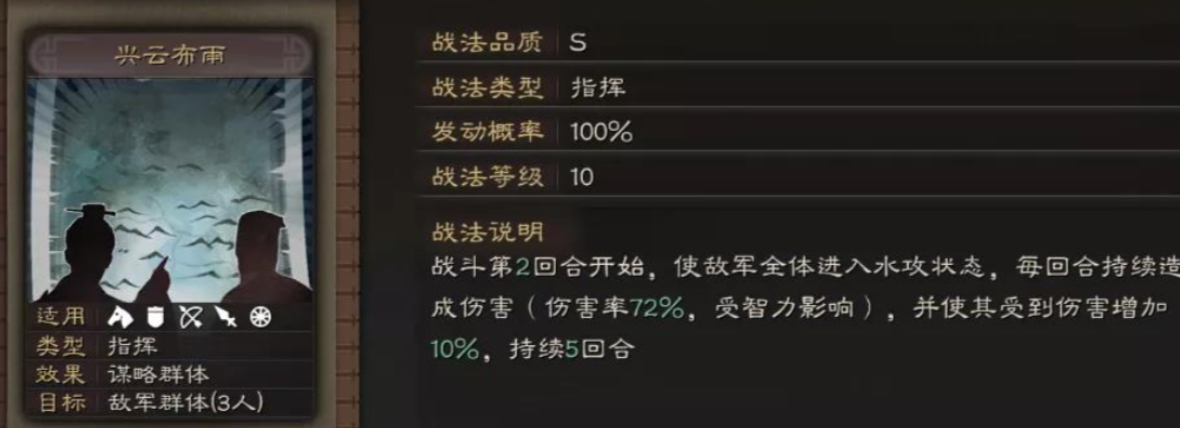于吉的核心战法兴云布雨是于吉在游戏中立足的重要技能。此战法可使敌方全队都陷入“水攻”状态,造成一定的法术伤害。该技能除了群体输出稳定之外,更主要的是自带的控制效果,给队友创造了一个非常好的输出环境。尤其是在于吉、张角两人同时上场时,可以组成控场与连携爆发的强力组合,张角用雷系战法造成持续伤害,于吉则给予敌人稳定的水攻状态,使敌人更容易陷入震慑与连锁反应之中。