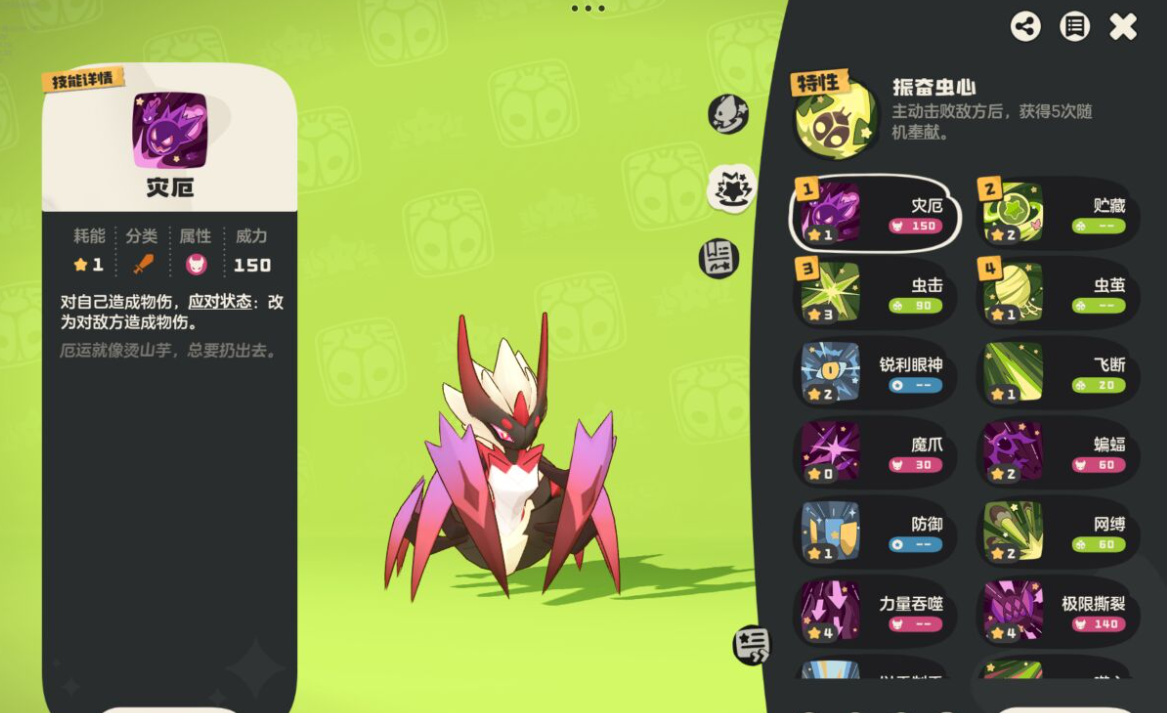 若计划捕获此精灵,推荐使用巨噬针鼹出战,并配置摇篮曲与防御类技能。开战后先用星星魔法使其陷入眩晕状态,随后补充一次能量药剂,将其初始能量降至零点。紧接着连续释放四次摇篮曲即可封锁其行动,阻止其继续自残。此时使用多个高级球便可轻松完成捕捉。