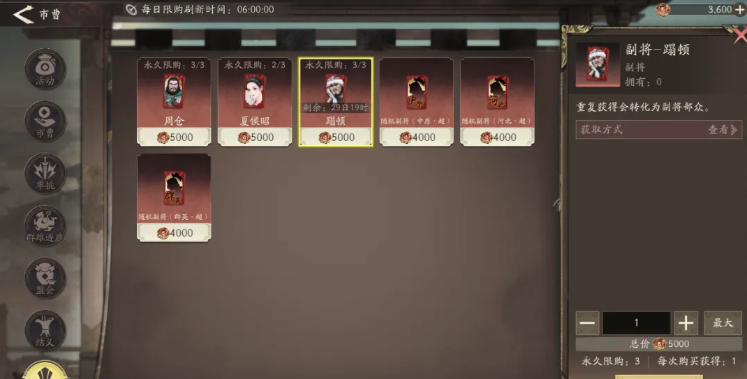蹋顿获取方式目前有两种,一种时通过江亭取物活动抽奖,拿到指定代币、在活动商店兑换,另一种是在副将商店,使用副将币兑换(感觉副将商店还是兑换专属副将好一点)。