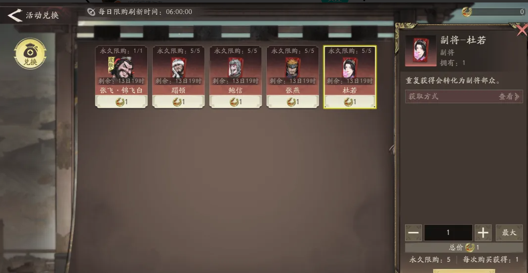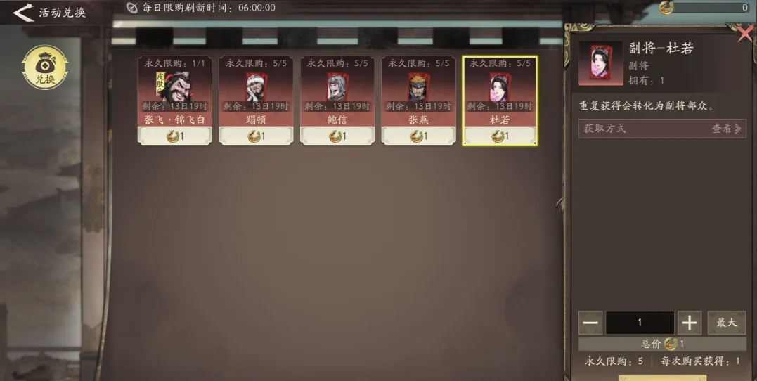 该活动商店的鲍信、张燕、杜若均可在副将寻访中正常招募、刷片,兑换这3个性价比不高。