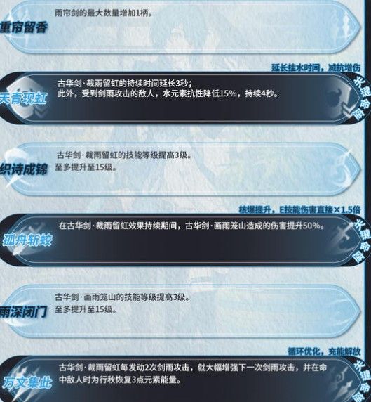 天青现虹:古华剑·裁雨留虹的持续时间延长3秒;此外,受到剑雨攻击的敌人,水元素抗性降低15%,持续4秒。