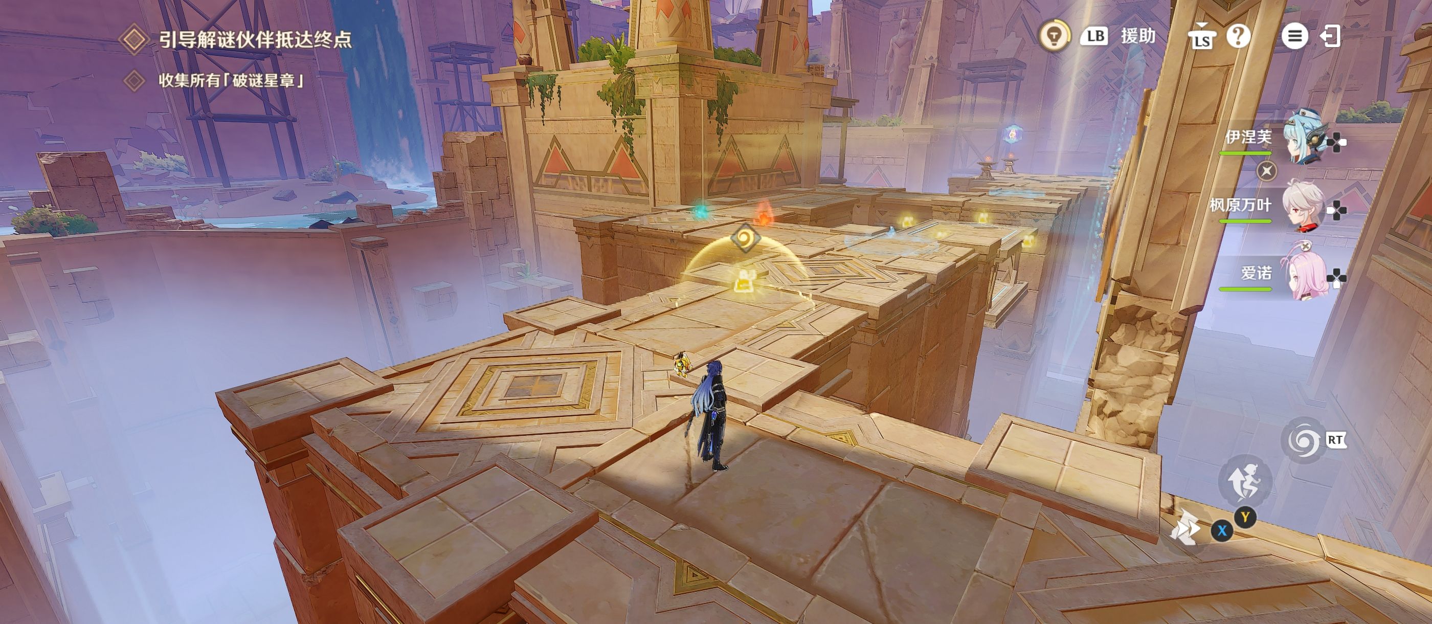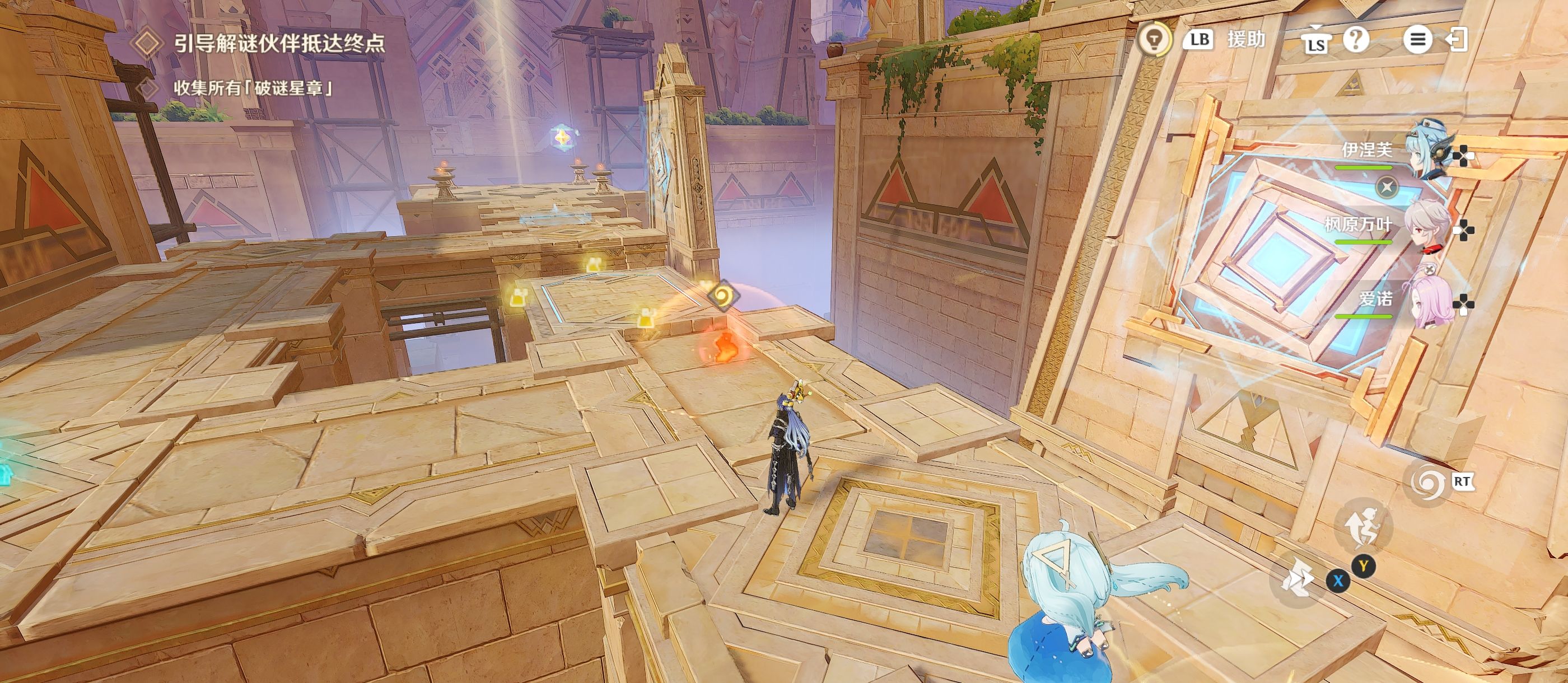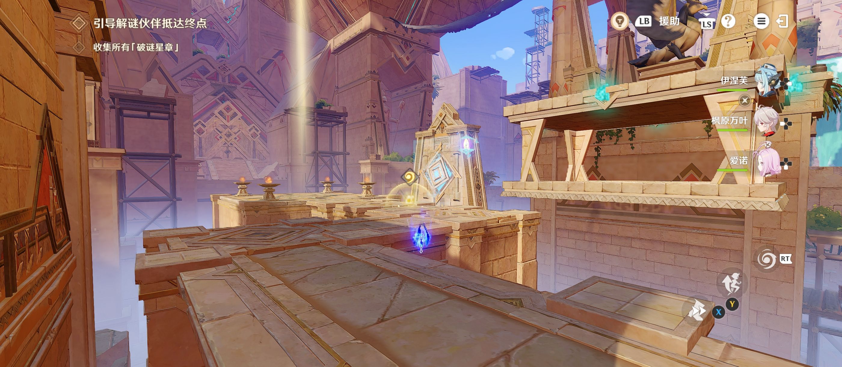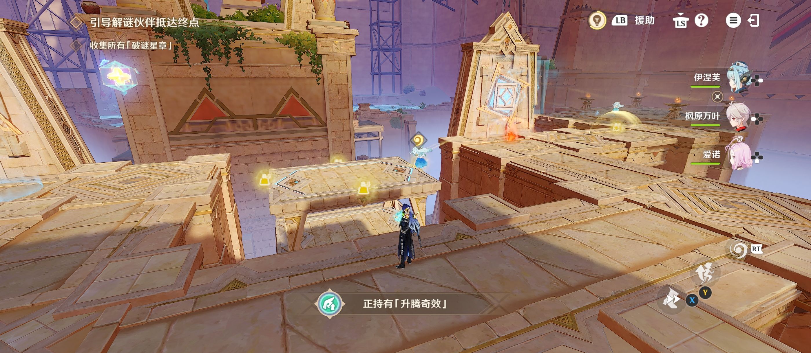 放置后,移动到[升腾奇效]旁,将其拾取并来到图中的位置上,当解密伙伴来到升降台上后迅速将[升腾奇效]放置在升降台上;(如时机没赶上可将持有的[磐固奇效]放置上去重新来过)