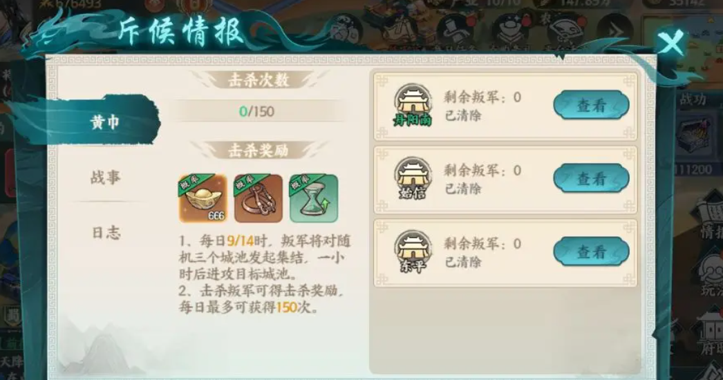 首先要了解的是“世界地图”的组成。主线推进到9-40关之后就可以正式解锁国战系统,可以选择魏、蜀、吴三大家族中的一个加入。从此你将置身于一张动态变化的大地图中,开始真正的天下争霸。整个国战由主城、州城、关口、要塞等城池构成,不同的城池防御力和驻军数量差别很大。每天的城战时间是早上九点到第二天凌晨两点,战斗节奏很快。系统会每天在固定的时刻派来黄巾叛军攻打城池,如果能成功抵御,就可以得到很多奖励。