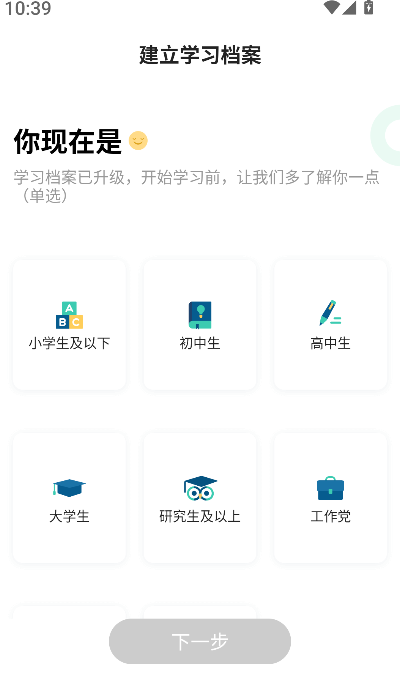 1、开启软件后,第一步按照提示创建个人学习档案,填写基础信息以及学习目标,这样系统就能规划出适宜的学习内容。