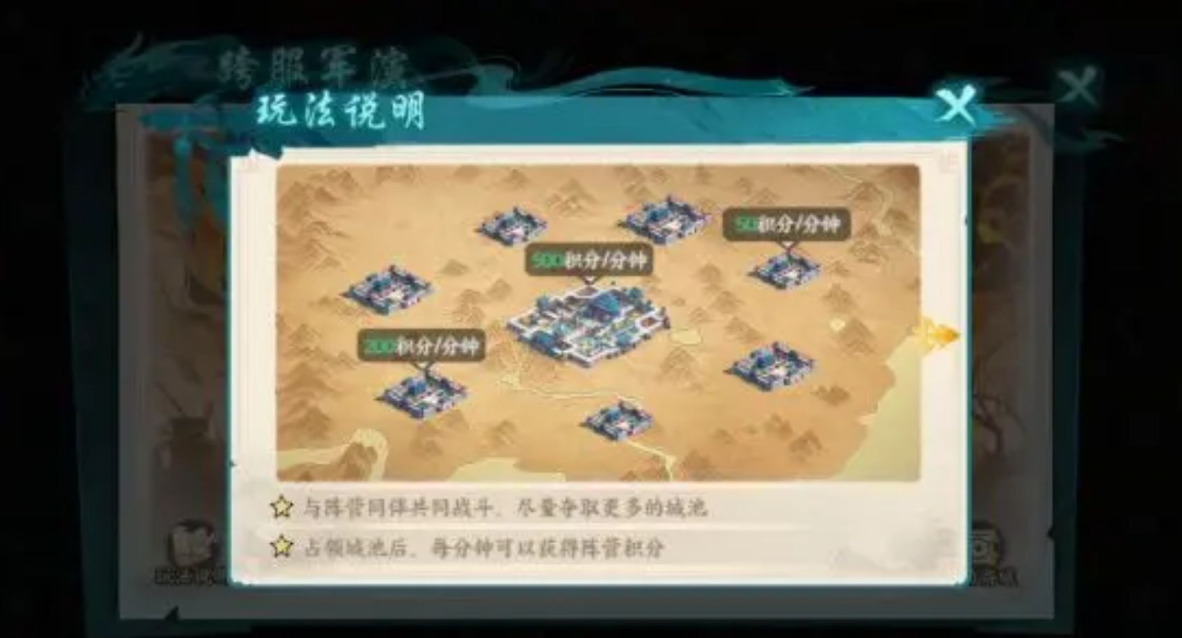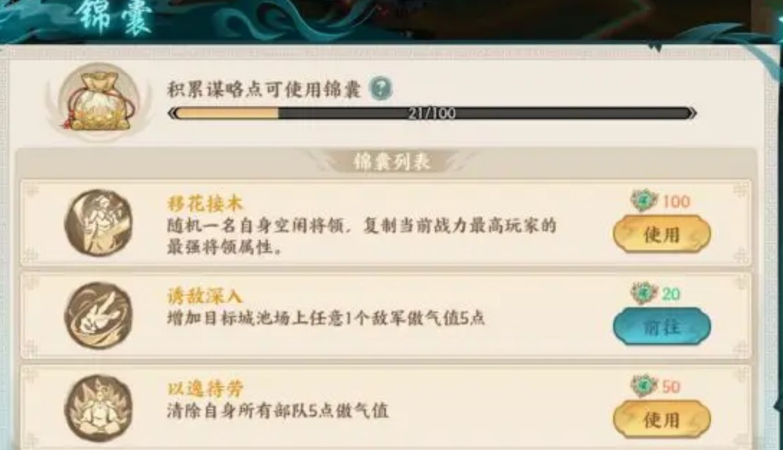 每次完成与敌人的作战或是成功解决所刷出来的事件后,各位还能获得谋略点奖励。玩家可使用谋略点在锦囊界面中激活不同的阵营效果,来为阵营里的全体玩家提供大量的增益,提高他们的作战效率。待跨服军演活动结束后,游戏会统一为所有阵营计算所得的积分,并根据积分确定各阵营的排名和发放排名奖励(以及个人奖励)。个人奖励中,除了必然会获得的军演币外,表现出色的玩家还能拿到军神称号以及更多的宝箱,阵营奖励则是会给予玩家丰厚的元宝奖励,