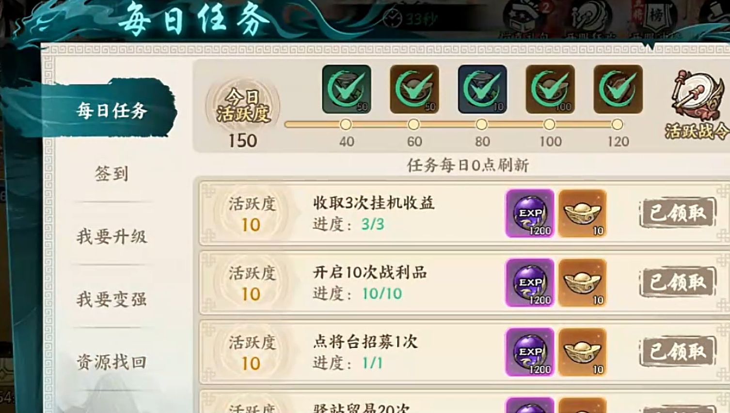 除了通过消耗时间来挂机外,完成每日任务里的各项内容也能让各位获取一定的经验资源,同时还能拿到元宝等较为重要的资源,但要注意不是每项任务都会给经验,因此各位在冲级时可优先去做那些给经验的任务,且每天都要将它们完成,让自己在开荒过程中能更快完成等级提升,否则就会损失这方面带来的经验收益。此外,在完成每日任务时各位也能顺道完成各副本的战斗任务,它们同样也有经验奖励,还能拿到各种材料。