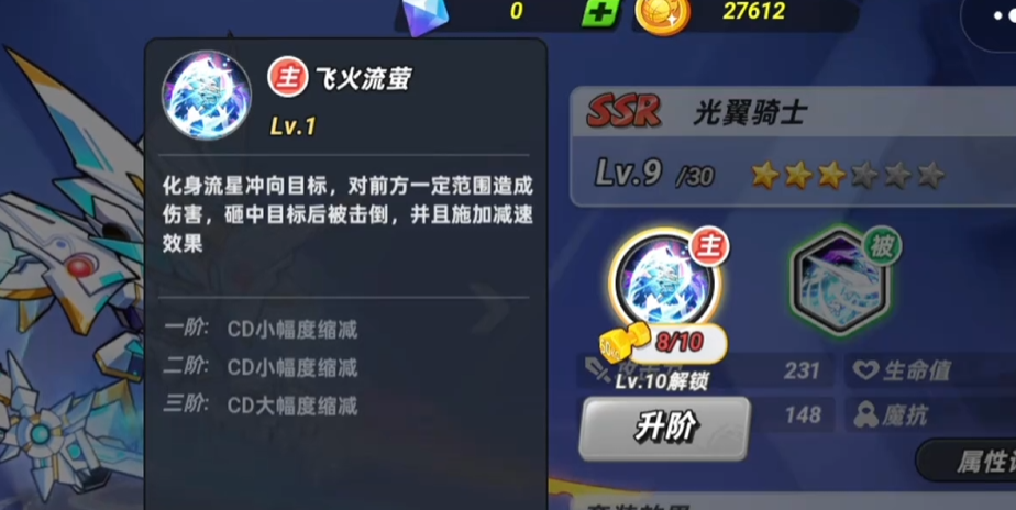 骑士的主要技能叫做飞火流萤。在施展之后将会化身成为流星,并且冲至目标,前方的所有敌人都将会受到一定范围内的伤害,在成功命中敌人之后,不仅能够将其击倒,还将会施展减速的效果,该技能是可以进阶的,当升到三阶的时候,技能的cd将会大幅度的降低。副技能光之翼,在施展之后将会触发火焰风暴,并向前方旋转,击中敌人后对其添加燃烧效果,并将其炸飞,如果在燃烧效果持续期间再次击中对方,则可再次炸飞。
