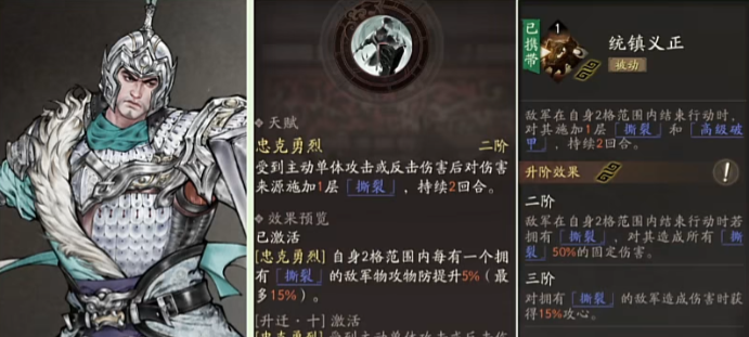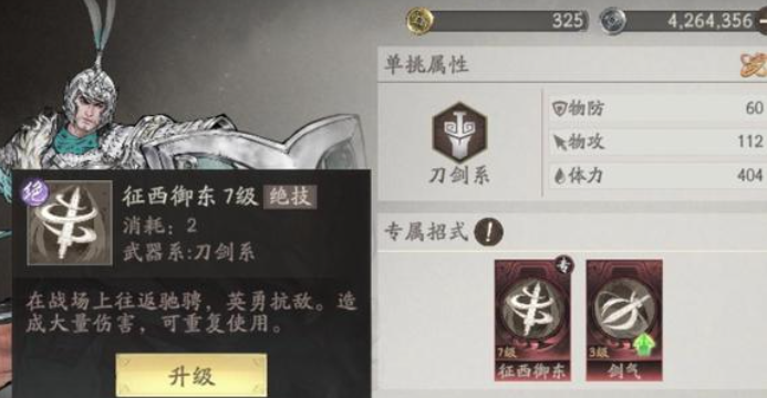 陈到的大招可以拼过很多的小招,一般都是从第二个回合开始他的强度就上来了,如果大家用陈到来过张辽的话,那么他的出招基本都会被整套的大招给拼掉,不管张辽是使用斗胸刀还是使用圈马刀,这里的陈到其实都是可以拼过他的一些小招式的,那么这里陈到其实后期用的话,大家可以利用全配被动来打很多的效果,所以在单挑挑战里面真的可以说是一个不亚于赵云的武将,他在天赋效果上面有一个征西御东的技能,这个技能是属于一个刀剑系的技能。