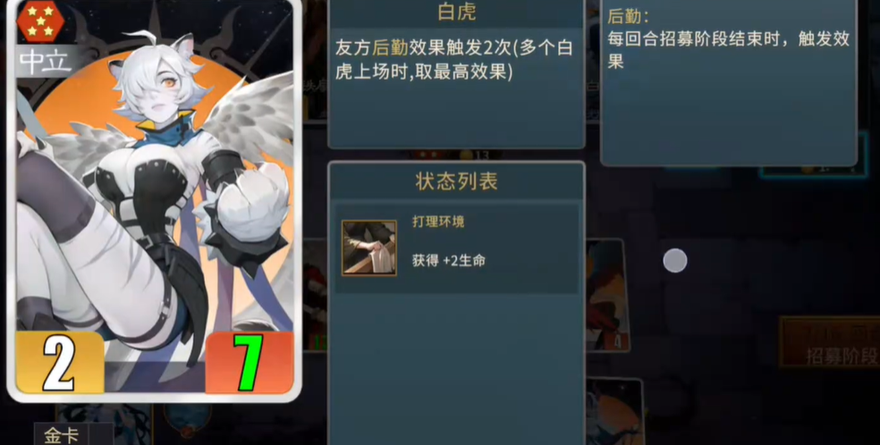 白泽和白虎如果能够协同组队,便是一个非常高效的产出体系,白泽可以为队伍提供更加稳定的产牌能力,对有白虎则可以让与它相邻单位的后勤效果持续放大到三倍,两个人的完美配合下可以让12张锦囊牌充足而稳定的供给,满足了对锦囊牌使用频率比较高的核心作战成员需求。