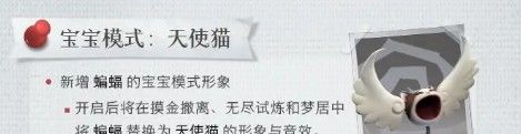 超自然行动组天使猫和纸片狼怎么样,宝宝模式新增蝙蝠和厄狼——天使猫和纸片狼,新增蝙蝠的宝宝模式形象,开启后将在摸金撒离、无尽试炼和梦居中,将蝙蝠替换为天使猫的形象与音效。还没有发现的玩家们可以退出游戏重进后就能看到。