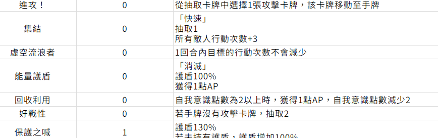 技能类卡牌中主打是功能辅助,可以调整战斗的局势。进攻卡牌,可以精准的检索攻击卡牌,可以解决在关键回合缺少输出的困境。能量护盾是稀有的卡牌可以提供100%的护盾,还可以额外的获取一点ap,攻防转换一键可以实现。在一费卡牌中坚固就可以有效提供150%的护盾。触发连击之后,下一个回合就能得到固定同等的护盾,可以有效保证生存的优势。重新整顿是一张传说卡,可以迅速的刷新手牌,而且还能够找到扭转战局的关键牌。