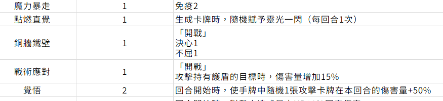 强化类的卡牌,虽然说数量并不是很多,可是从根本上就能有效提升战斗力。铜墙铁壁在开战阶段就可以获得不屈以及决心buff,可以增强队伍的续航能力。战术应对主要是针对那些带护盾的敌人,可以额外的增加15%的伤害。让输出更有针对性,另外还有觉悟,每一个回合全部都可以随机强化一张攻击卡,有50%的伤害加成,在长期积累之后自然就会有惊人的效果。适合于极限输出阵容,然后去追求爆发性的伤害,所以掌握这一些也是比较关键的。