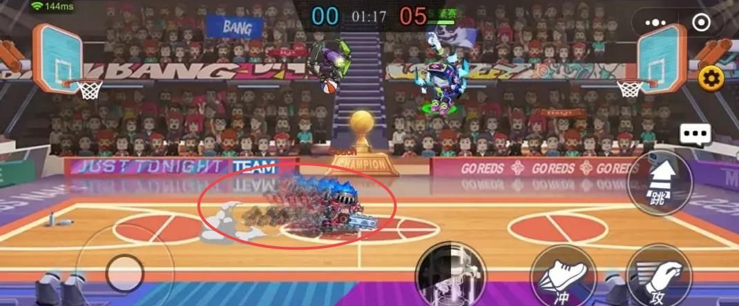 首先是最基础的操作,左右移动屏幕左边的摇杆即可使角色移动,而如果将摇杆向下拖动的话,则会进入胯下运球的状态,但是该状态会消耗体力。点击两次跳跃时可触发双跳,拦截敌方的高球,但球在自己手中时该技能禁用。点击冲字按钮,可向指定方向移动一段距离并打断敌方的运球。如果你在敌方灌篮的时候快速跃起并点击盖帽按钮,则可成功盖帽,从敌人手下抢分。