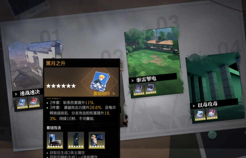 但如若玩家并不能够凑齐四件套,也可以直接穿戴两件套效果,值得一提的是,玩家凑不齐buff时,穿戴三件同属性的套件,也并不能够强化输出,如若仅有两件套装,后续两件套装可以直接穿戴单件的“黑月之声”,并且佩戴上提升暴击率的装备即可。