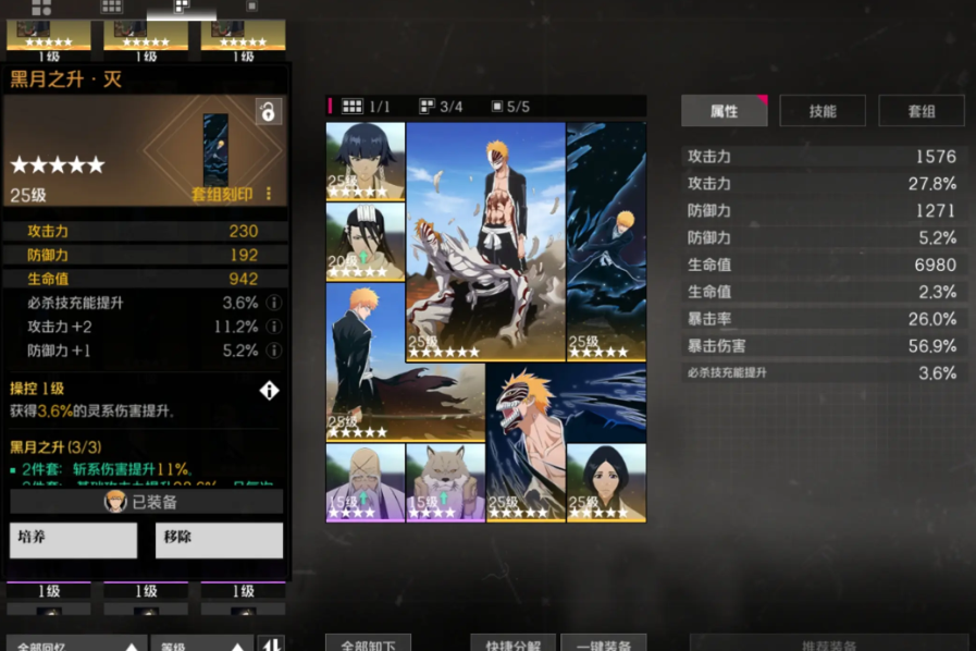 套组选用方面,可以使用“黑月之生”,作为黑崎一护的主要毕业套装,他能够直接强化“月牙天冲”,以及黑崎一护的黑月系列技能,在释放大招期间,可以增强派生技的效果,装备搭配方面,如若玩家收集两件套,则可以提升黑崎一护分支强化攻击15%的伤害倍率,泛用性非常高。
