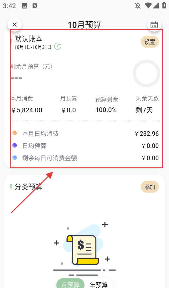 4、确定月份后,即可查看该月预算详情,包括本月消费、月预算、预算剩余、日均消费等数据。