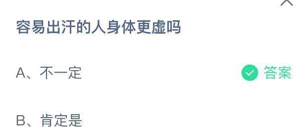 以上就是容易出汗的人身体更虚吗,支付宝蚂蚁庄园2025年11月18日答案最新,更多精彩内容,请点击关注更新!