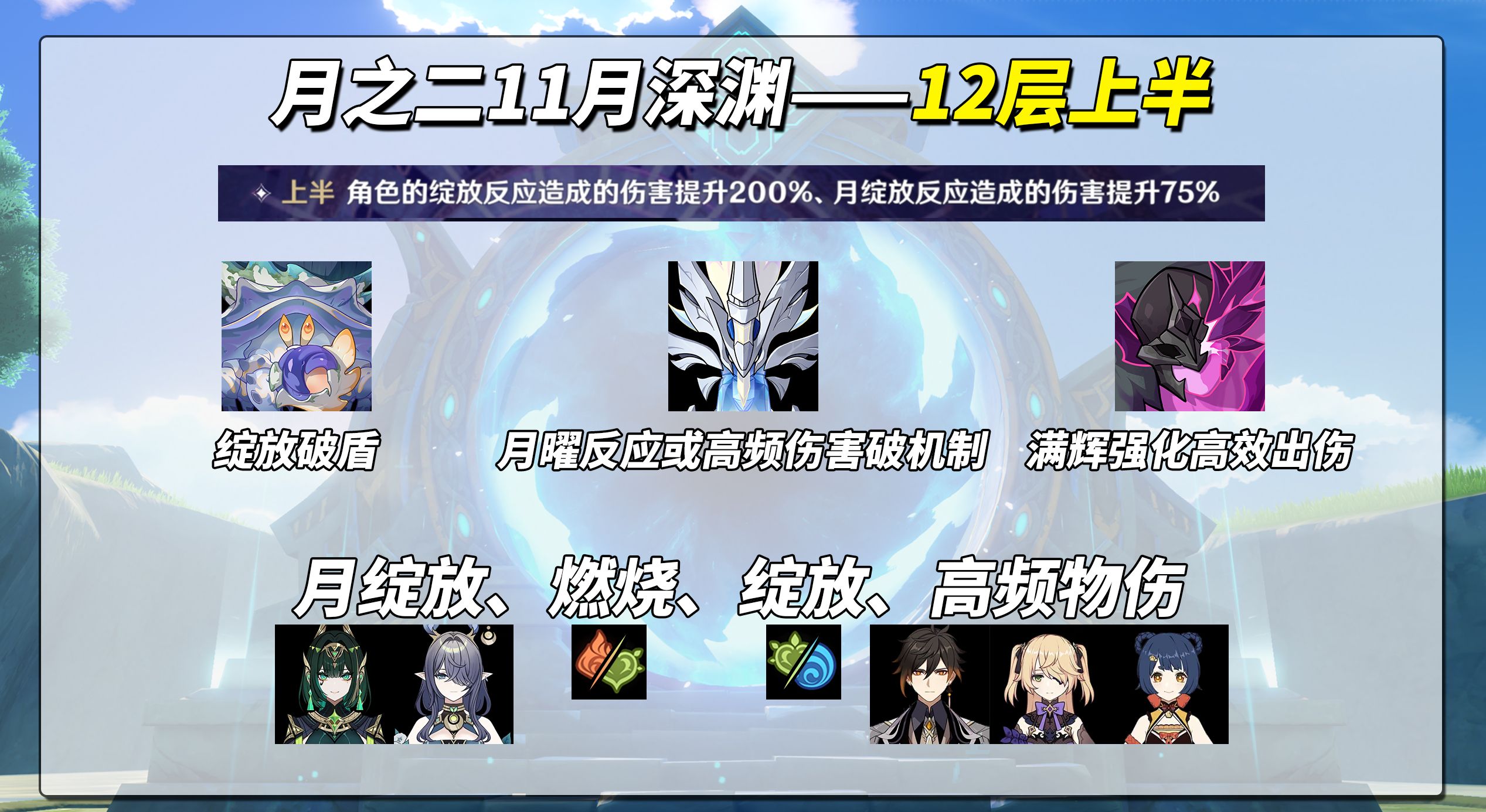 环境效果“角色的绽放反应造成的伤害提升200%、月绽放反应造成的伤害提升75%”,结合3关原魔来看,奈芙尔与菈乌玛这种月绽放最优,其次燃蒸、绽放。