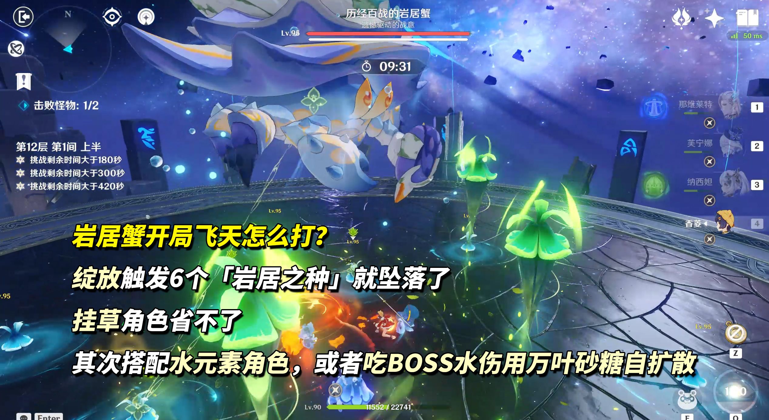 岩居蟹登场会直接飞天开盾,随后在场上留下大量的「岩居之种」,绽放反应激活6个「岩居之种」即可将BOSS破盾打下来,2种策略: