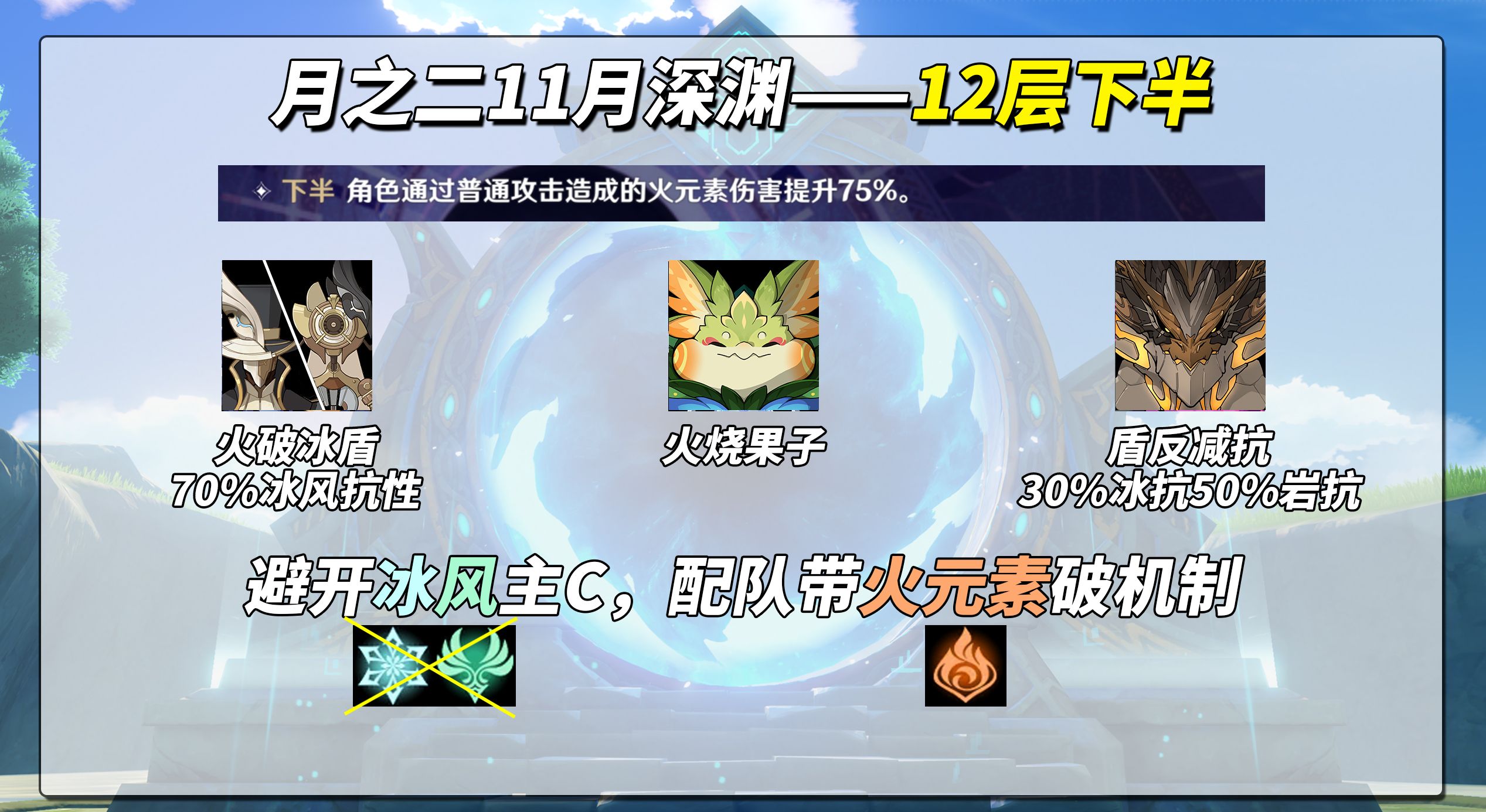 【推荐队伍】队伍内存在火伤破盾即可,排除冰风输出(敌方抗性高)。