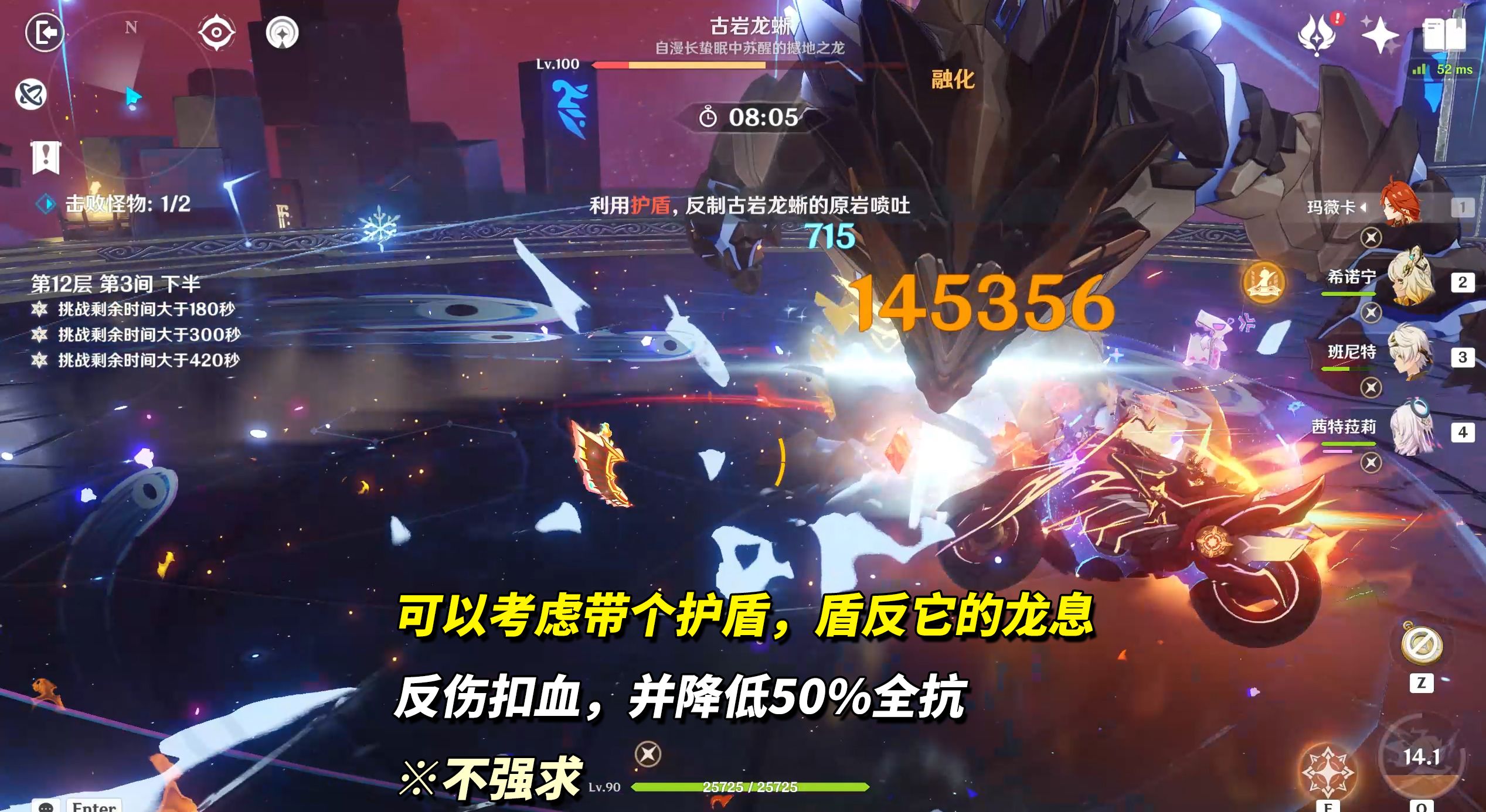 12-3下半,古岩龙蜥(413万血)。也是许久未见这个BOSS了,此次深渊为冰元素古岩龙蜥,拥有30%冰抗50%岩抗,在目前多样化的减抗手段面前,这点抗性基本对配队无影响。对局中它的龙息命中护盾触发盾反,扣除BOSS血量+降低50%抗性,有盾也可带上能省不少时间~