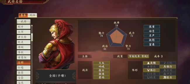 就武将属性而言,全琮是典型的全能型中坚武将。他的武力值是72,统帅值达到78,智力也达到了75,这样的数值说明他既可以指挥作战,又可以亲自上阵输出。速度45并不算好,但是成长率高,在后期培养中仍然有发展潜力。政治和魅力都一般般,不过在内政任务以及辅助玩法上仍然可以带来一定的收益。而且全琮的成长曲线很平缓,使他在各个时期都具备战斗力,不会出现前期强大后期衰退的现象。
