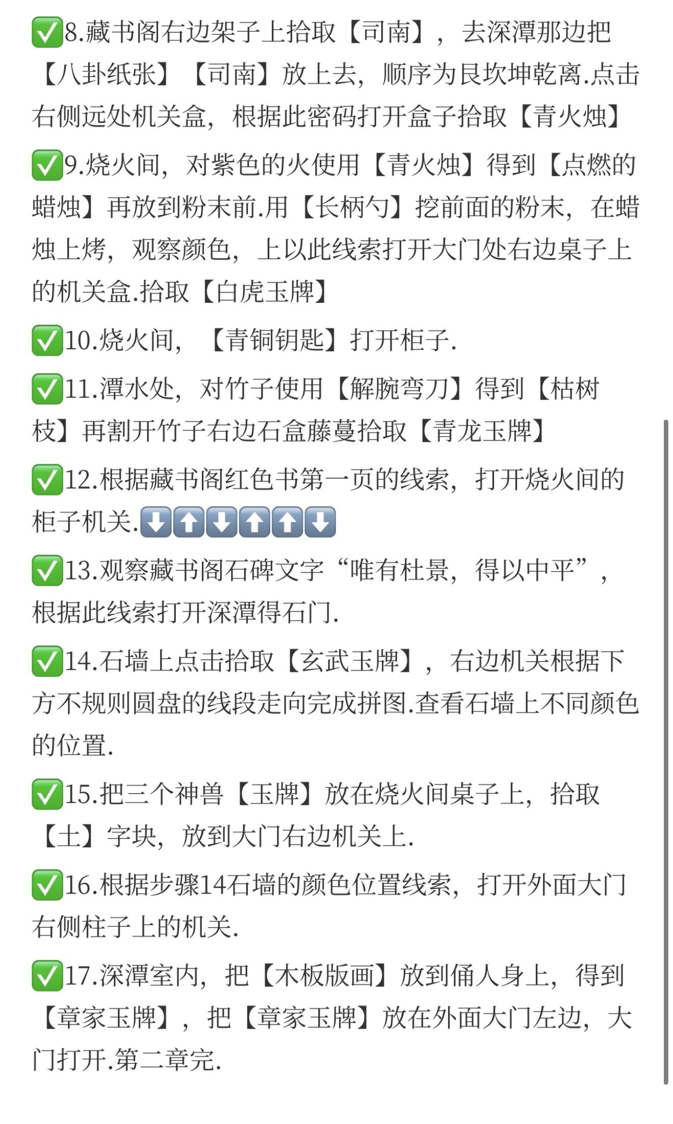 8、藏书阁右边架子上拾取【司南】,去深潭那边把【八卦纸张】【司南】放上去,顺序为良坎坤乾离、点击右侧远处机关盒,根据此密码打开盒子拾取【青火烛】