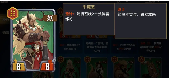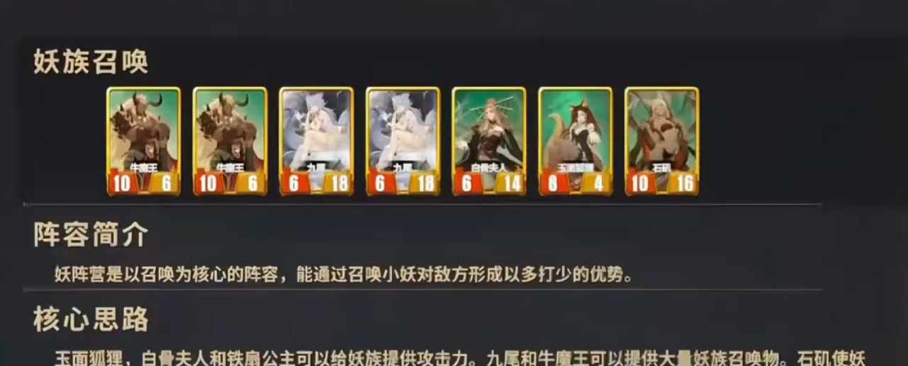 在妖族召唤流当中,铁扇公主能够为召唤物提供高额的攻击加成。在整个召唤流当中,铁扇公主作为攻击主力,时机娘娘,他其实能够有效地补充战场的兵力,这样就能够形成打不死的压制。牛魔王是特别重要的,因为它的出现能够持续性的压制,可以有效的提升整体的召唤率。另外在召唤流派当中,还会涉及到白骨夫人,他能够有效的保证血量,让战力处于稳定的状态。黑熊精,它能够保护后排的输出。