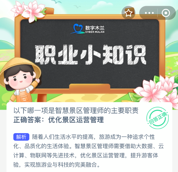 以下哪一项是智慧景区管理师的主要职责?【蚂蚁新村每日一题】2025年11月19日题目已发布!坚持答题,积累木兰币,即可加速小镇建设。答对本题,立即可享“产速+3/时”的加速奖励!今天正确答案是【优化景区运营管理】。智慧景区管理师需要借助大数据、云计算、物联网等先进技术,优化景区运营管理,提升游客体验.