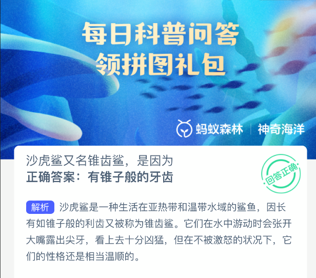 以上就是沙虎鲨又名锥齿鲨,是因为?神奇海洋今天答案最新2025年11月19日分享,更多相关攻略内容,请点击关注更新!