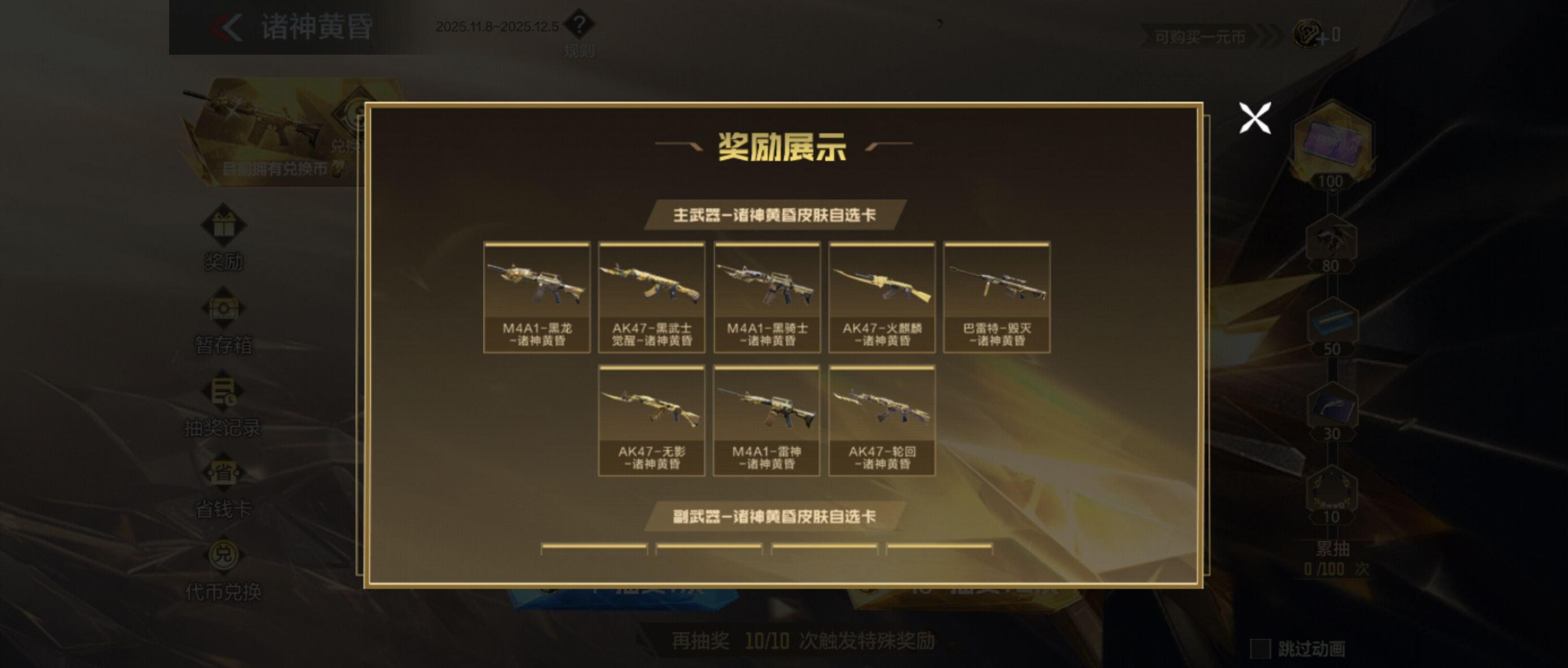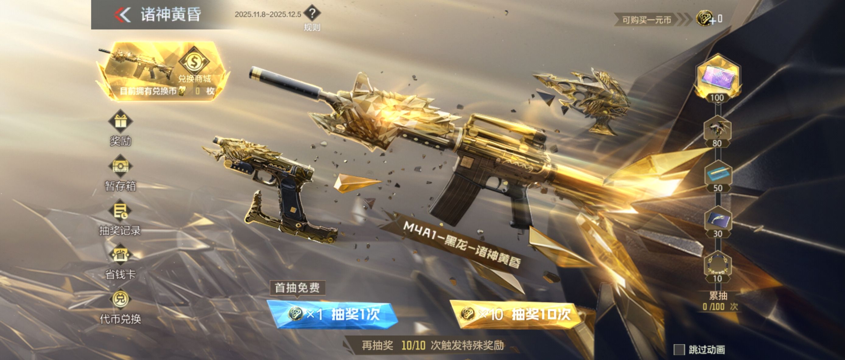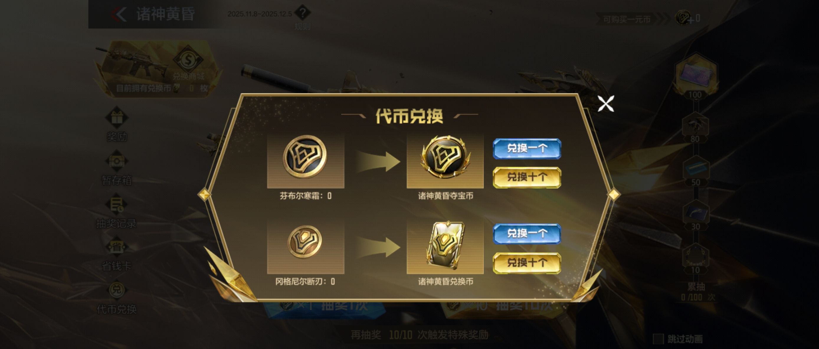 玩家在参加诸神黄昏夺宝的时候,需要了解,他其实通过抽奖的方式开展,而在抽奖的时候需要运用到代币,如果玩家单抽的话价格是6元,10连抽的价格是50元,目前部分商城还直接推出了一元购代币的优惠,所以玩家在选择抽奖之前,自己要决定是否要购买代币,毕竟在游戏当中,玩家其实是能够通过完成对应的任务来免费的获取代币。举个简单的例子,比如CFM币商城的20连抽福利,这样的话玩家其实就有机会低成本地获取代币。