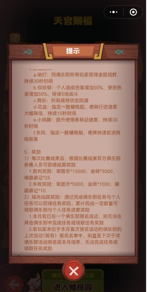 玩家想要参加蟠桃园的时候先要了解基础的规则,比如说俱乐部想要参加蟠桃园的时候需要里面的成员至少有20个人,并且要按照赛季提交对应数量的陆梦玲。另外玩家还需要注意在参加蟠桃园的时候,时间是在每个月的前三个周日的8:00~18:00玩家可以报名。当然报名也可以有对应的俱乐部的管理去操作,而比赛的时间只有30分钟。其实在比赛的时候玩家需要注意比赛将会在晚上的8:00~8:30,它其实会直接匹配两个俱乐部,进行1v1的实时对抗。玩家在参加比赛的时候,它们的最终目的就是抢夺蟠桃权控制权,并且要将船送到终点。这样的话,玩家就能够累积对应的积分,一旦最终的积分最高的俱乐部将会获胜。