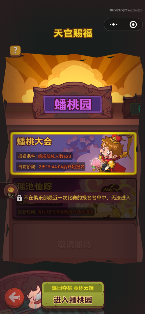 其实蟠桃园的玩法是每周日晚上的8:00~8:30,这个时间是固定的,所以说玩家如果想要参加的话,肯定要提前安排好时间。并且在比赛的过程当中,玩家需要保持在线的状态,避免在这个时候直接错过了关键性的对抗阶段。对于玩家来说,它们在参加蟠桃园活动的时候也可以尝试利用免费的复活机制,一旦复活之后,玩家其实就能够持续性的投入到战斗当中,这样的话才能够保证整个团队的战斗实力。