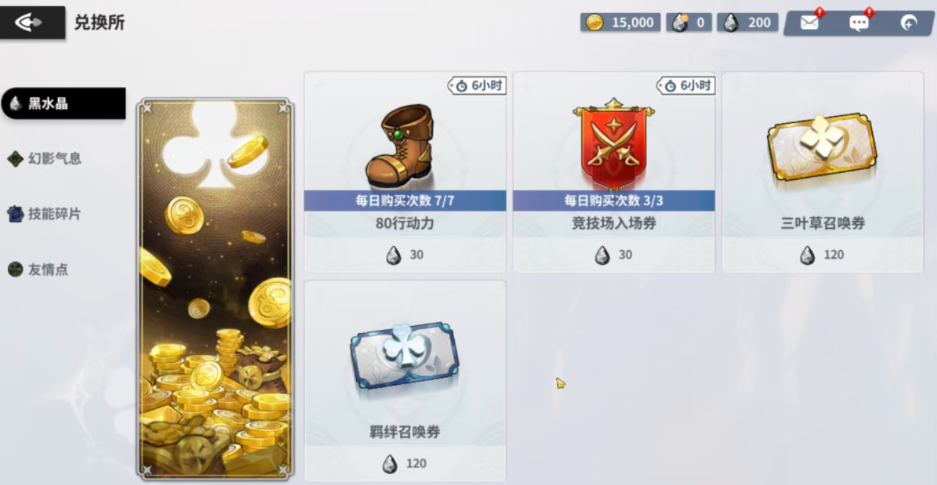 幻影气息在游戏内的作用也非常丰富,首先就是能够用来兑换一些行动力,提升自己的战斗水平,这样推进主线剧情的速度会更快一些。当剧情推进到第1章的第7节时,还将会解锁额外的副本挑战,这也是你前期获得经验最主要的方法之一。其次就是在商店中,你可以看到幻影气息是能够用来兑换金币的,一次能够兑换1万枚。由于大家在游戏前期都非常的缺金币,因此幻影气息也是帮助你获得金币最重要的方法。