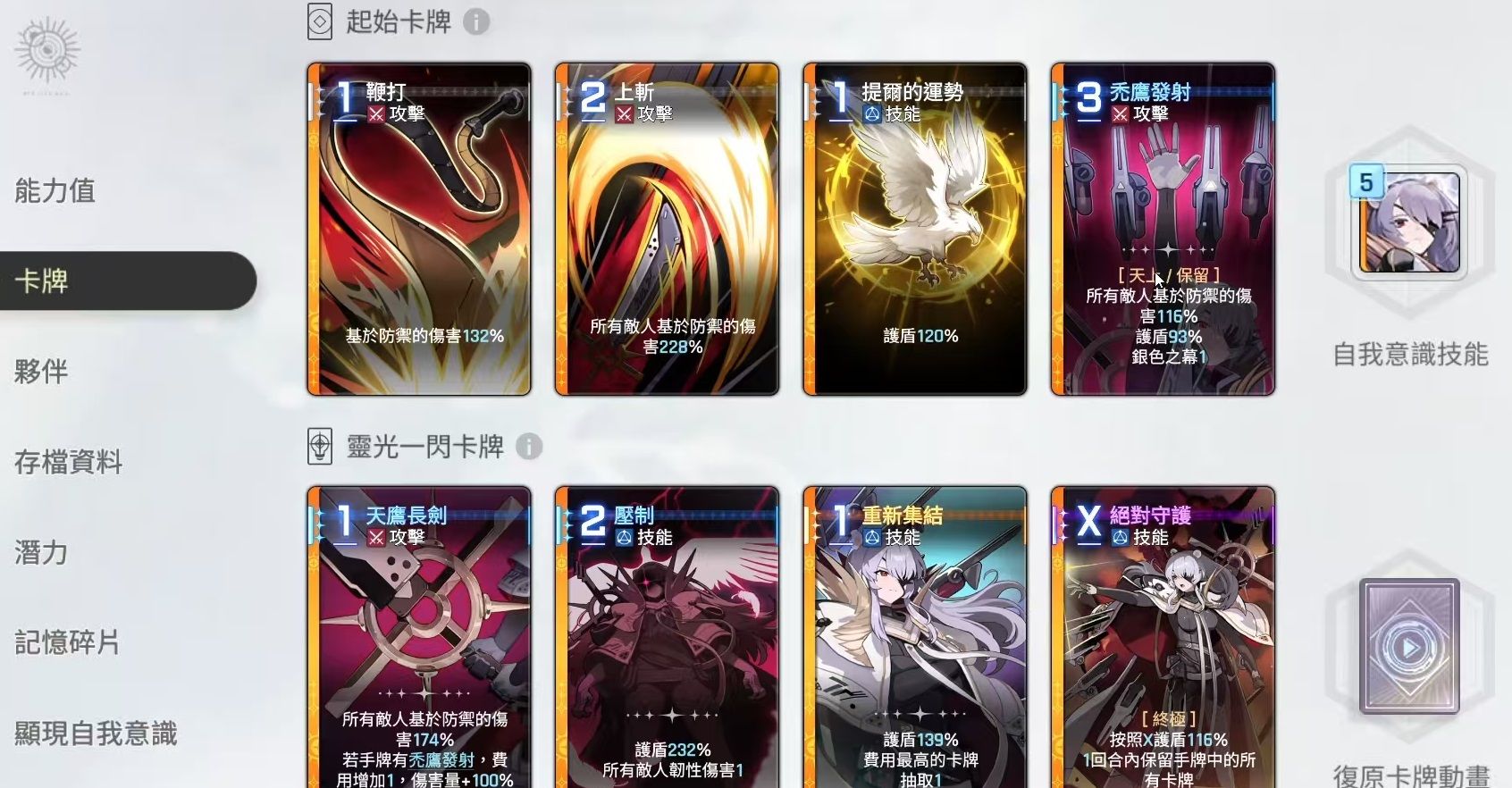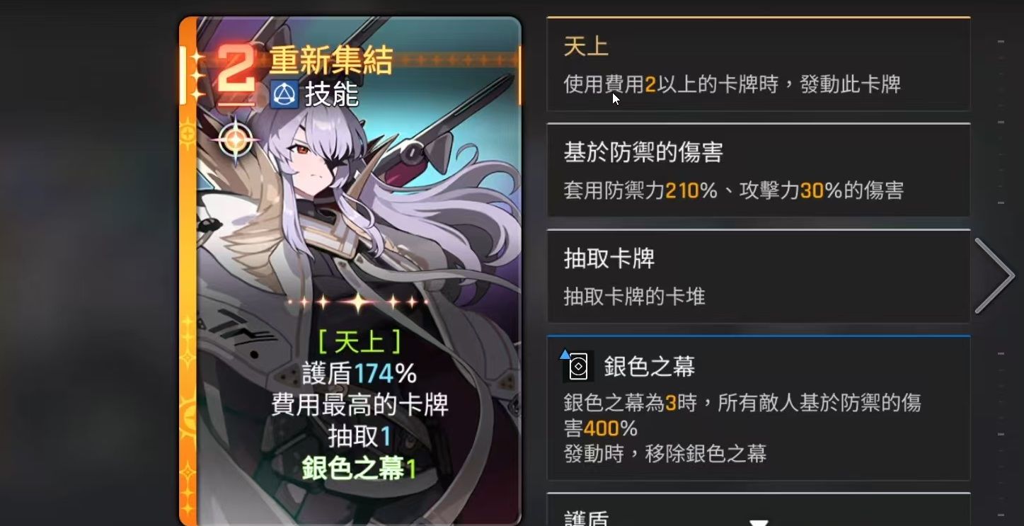 其余独特卡牌包括:“天鹰长剑”,可对全体敌人造成150%防御伤害,若手牌中持有“秃鹰发射”,则此卡费用+1但伤害翻倍至300%,建议优先于“秃鹰发射”打出以最大化收益;“压制”提供200%防御护盾并施加1点韧性削减;“重新集结”可在获得120%护盾的同时,抽取一张最高费用的手牌,增强后续回合调度能力;而“绝对守护”不仅提供高额护盾,还能保留当前所有手牌至下一回合,极大提升了策略灵活性和容错率。