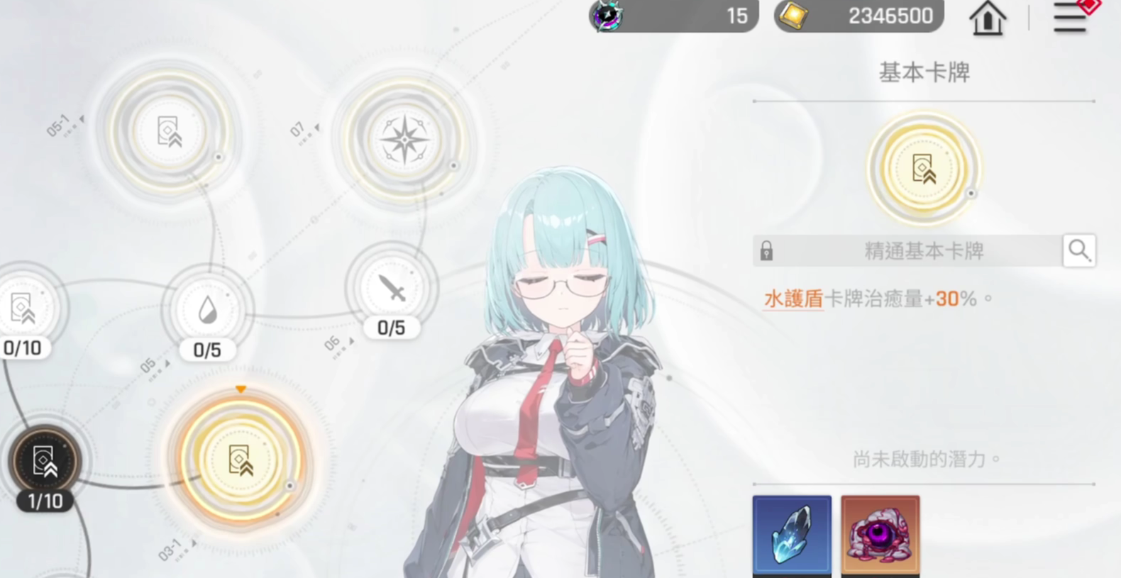 然后就是关于米卡的潜力部分,这个角色基本上就是有三个稍微特别的节点,而他之后的两个特殊节点都要求特定的属性才能够解锁,而他的潜力点进行解锁之后还能够对自己的技能卡牌提高技能属性,并增加回复治疗量这一类,玩家们的自我意识恢复率越高,所获得的助益越强,而玩家们在游戏中最需要做的就是不断地对米卡的各种未解锁部分一一解锁。