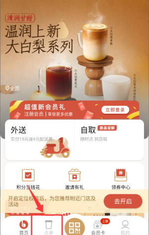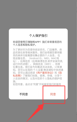 1、启动贝瑞咖啡应用,确认用户服务协议和隐私政策后进入。