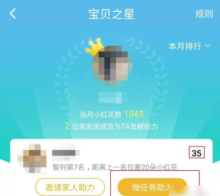 如果我们想增加小红花数,提高小朋友的排位,宝贝之星中的任一个小朋友头像,进入“宝贝之星”;可以看到我们暂列第七名,据前一名仅差20朵小红花,我们的小红花数是“35”朵。我们点击下方的做任务助力;