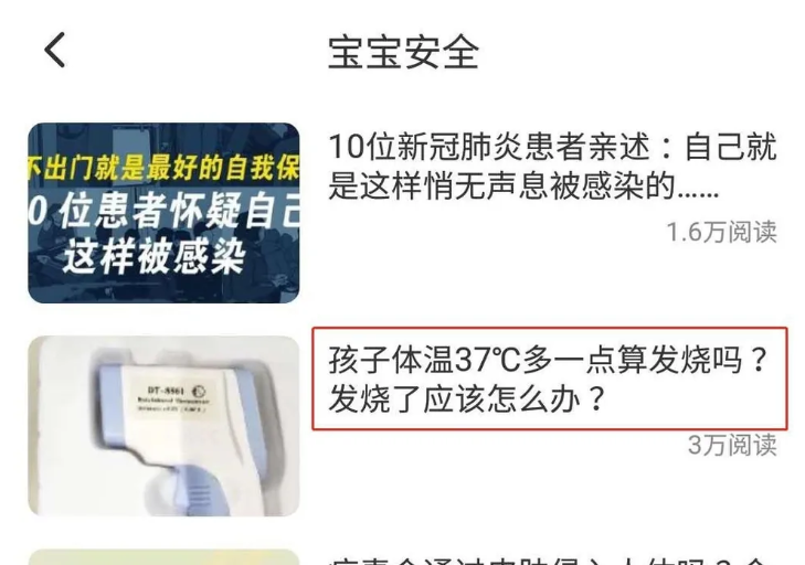 “宝宝安全”里面是针对宝宝生病的一些常识和建议,我们选择第二篇文章:孩子体温37°一点算发烧吗?发烧了应该怎么办?,点击文章;