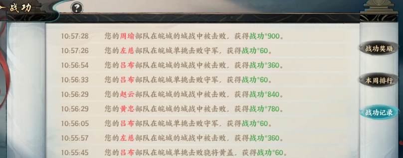 在获取战功秘籍之前,需要先了解战功的核心。最基础的是部队在被消灭之后就可以获得360战功。在击杀npc部队之后也可以获得战功,如果击杀敌方玩家的部队也是360战功。在这里还有一个建筑战功,在s1之后每天20次即可,每一次大概是花费5000个铜币,这纯属就是浪费。很多的玩家都会以为杀的部队越多,那么更有机会获得武功秘籍,其实并不是如此。在粮草充足的时候,直接让部队自动攻击比自己等级高的城池,例如100级打180级,虽然死得很快,但是一轮下来就可以拿到1800战功。这也是获取武功秘籍的关键。别人打一轮,可是你就能够刷三轮到四轮,很适合每周最后冲榜使用,需要提前的囤好。
