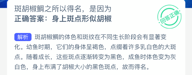 斑胡椒鲷之所以得名,是因为?【神奇海洋】11月23日新题目已开答!正确答案现已公布,点击领取拼图,一起为修复海洋生态贡献力量!今日正确答案是:【身上斑点形似胡椒】。斑胡椒鲷的体色和斑纹在不同生长阶段会有显著变化。随着成长,这些斑点逐渐转变为黑色,成鱼时体色变为灰白色,身上布满了胡椒大小的黑色斑点,故而得名。
