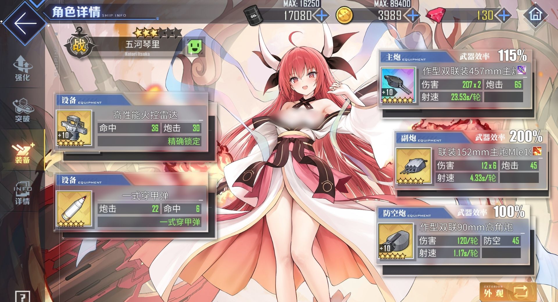 同时,五河琴里的专属兵装灼烂歼鬼还能进一步提升她的生存能力,只要在战斗中五河琴里的耐久下到70%以下,那么她会缓慢地为自身恢复耐久,其效果为每5秒2%。此外,五河琴里在舰装搭配上与常规金战列的配装没有太大差别,有彩炮可用彩炮,每彩炮就用欧根炮、弗兰炮或紫MK6,防空炮优选STAAG,副炮装任何泛用轻巡炮即可。无调速要求的情况下,金火控加白弹是很适合五河琴里的设备选择,有调速需求则用黑弹、弹链等设备来进行调速。