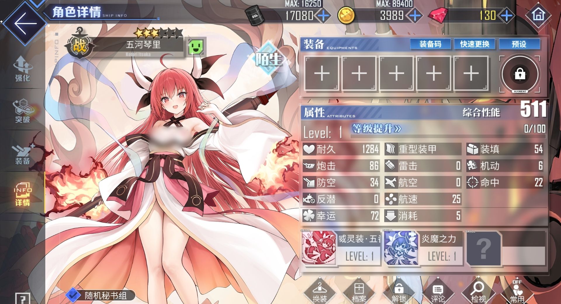另一技能炎魔之力可在未装配专属兵装时,令五河琴里受到的点燃伤害降低,自身受到致命伤害还能回避掉本次的攻击,同时让自身进入持续10秒的无敌时间,但每场战斗只会发动一次,而且每当敌军舰船进入自身防卫范围内后,五河琴里还可获得减伤被动。可见,五河琴里能凭借炎魔之力这一技能,让自身拥有极强的生存能力。在装备了专属兵装后,炎魔之力技能还能进化,可提升五河琴里自身的炮击值和防空效果,更能在触发致命伤回避后为自己回复耐久。