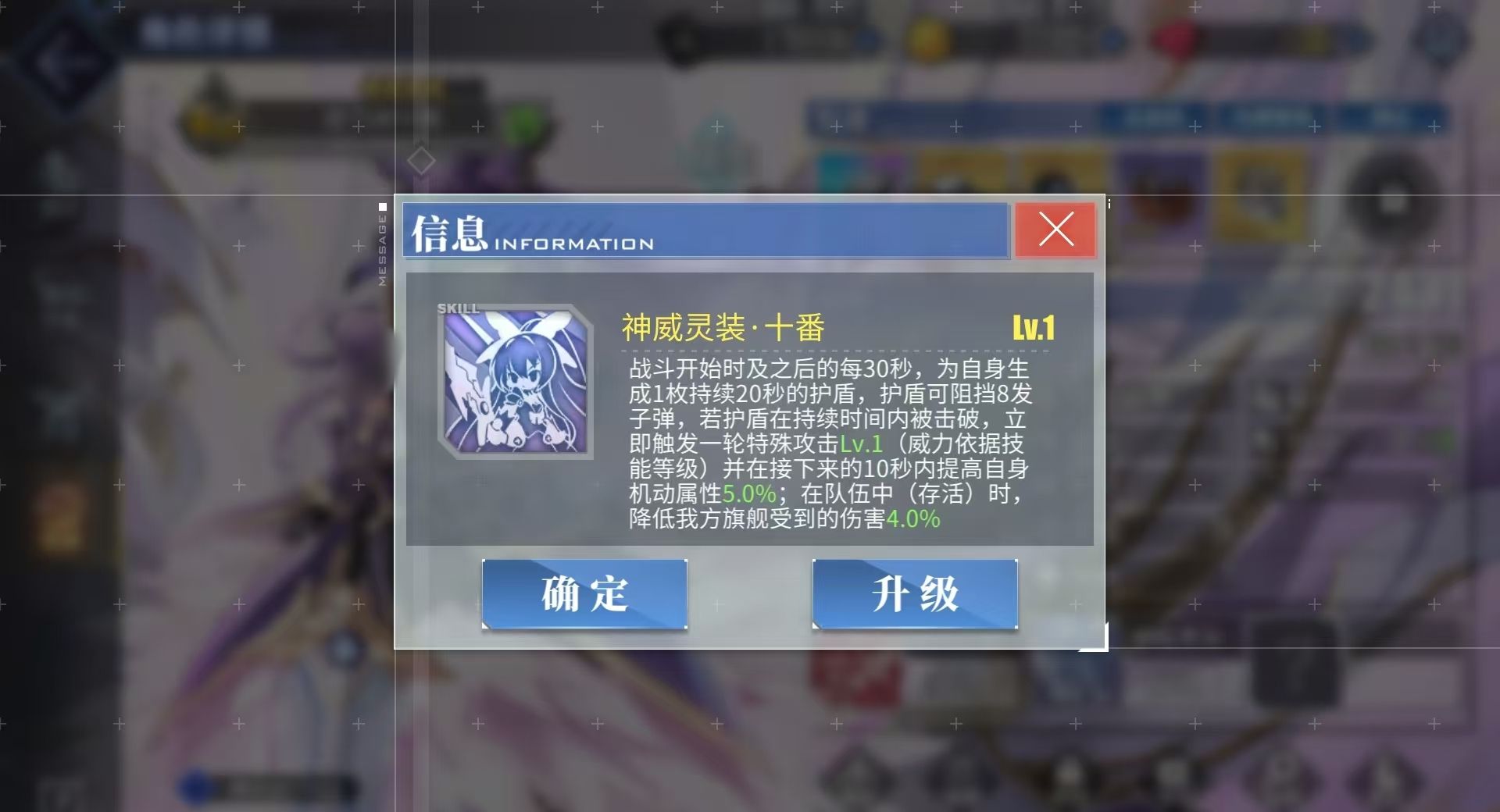 她的二技能则是一个偏防守向的技能,从战斗开始夜刀神十香每30秒都能获得一个可抵挡8颗子弹的护盾,护盾存续时间内她不会受到任何伤害,且在存续时间爆开后,还能为夜刀神十香增加最高15%的机动,令她能更好地规避护盾消失期间的攻击。最重要的是,只要夜刀神十香存在场上,旗舰便能一直享受伤害最高降低10%的被动,即便敌人有跨射和较出色的空袭能力,也无法轻易越过前排船将旗舰击毁,全队也不会因旗舰被击毁而被强制判定为作战失败。