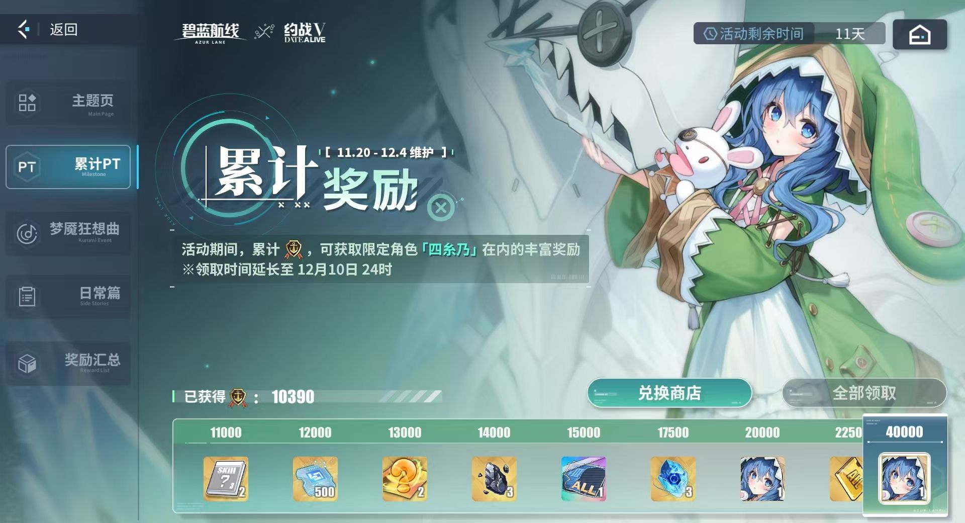 四系乃需通过完成活动内容获得PT(战役贡献),待PT的累积至足够数额后,就能在累积奖励中领取四系乃,无需玩家从联动卡池里抽取。累积奖励共有四个不同的档位可让人们拿到是四系乃,分别为一万、两万、四万和六万,共计能获得四次。全换出来后,玩家再为四系乃消耗一只金布里,就能令她达到满星,因此养成压力也比较的小。而且四系乃的专属兵装也很好获取,当活动异常海域完成第四阶段的奖励后,各位就能在邮件里领到。